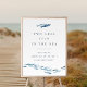 Our coastal chic design for summer weddings, engagement parties or rehearsal dinners features a pair of blue watercolor fish breaking ranks with a school of smaller fish along the bottom. "Two less fish in the sea" appears in elegant navy blue lettering. Personalize this event welcome sign with three lines of custom text. Available professionally printed or as a digital download for local printing.