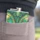 Two metal flasks with vibrant green tropical leaf designs over a geometric pattern. The tone is lush and lively, evoking a sense of nature.