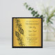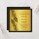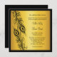Two intricately illustrated peacock feathers highlight this invitation, on an illustrated gold background.