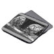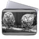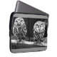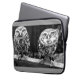 Laptop protective sleeve with a black and white design featuring two owls. Gray background. Available in sizes for 10", 13" and 15" notebooks.