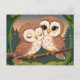 Two owls perched on a branch, their round eyes wide and alert. One has soft brown feathers speckled with white, while the other showcases a slightly darker plumage. Surrounded by a backdrop of dense, leafy trees, they sit close together, exuding a sense of calm and wisdom as they observe their surroundings.