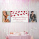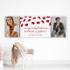 Modern joint graduation party banner featuring a simple white background that can be changed to any color, 2 photos of the graduates, falling red mortarboard caps, and a modern text template that is easy to personalize.