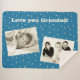 Pretty blue sherpa blanket with two large photo templates and custom text across the top. This warm and cozy gift blanket comes in three sizes and is made with large photo templates to fit the largest size blanket. Tiny yellow and white hearts make a background pattern and is a beautiful keepsake gift for grandparents, or any family members. Your photos should be large enough to fit within the photo holders which measure 14 x 11 inches when ordering the largest size blanket. Your photos can be a different size, but large enough to not have the yellow "warning" show up. If you see the warning, it means your photos will be blurry because they are too small. You may need to order a smaller size blanket, or find larger photos.