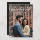 This stylish save the date features a retro inspired script "save the date" in white at the top of a full vertical photo along with simple custom text. The back of this modern save the date has a chic black stripe along with a horizontal photo, room for a custom message and a QR code for your wedding website. This vertical design is great for a trendy and stylish couple, and it's a great way for the engaged couple to share wedding information with friends and family. Find more colors and styles in the collection by Lea Delaveris Design. Also available as a digital save the date download.
