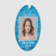 Oval Christmas ornament for a daughter. Blue water background with square photo template on the front, with her name in elegant script. "Christmas" and the year date is printed beneath the picture, with one more photo template on the back. Makes a beautiful holiday gift and keepsake for the family.