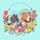 Two Pitbull dogs surrounded by flowers, one gray and white and the other brown and white, in a light blue background.
