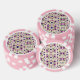 Two poker chips with pink borders and intricate