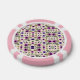"Two poker chips with pink borders and intricate floral patterns featuring purple and pink flowers on a beige background, shown from front and back."