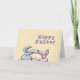 Two cartoon rabbits one blue and one pink peek up from the bottom of the card. Happy Easter at the top right. A cute and simple way to send someone an Easter greeting.