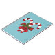 Destei's original illustration of two red and white striped Christmas candy cane treats decorated with a red bow and a Christmas holly / Common holly plant. The background color is blue.