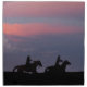 My photo of the silhouettes of three horseback riders galloping across the horizon with a colorful sunset backdrop. This only shows two of the three riders.