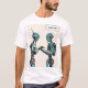 Two robots facing each other, one writing a greeti T-Shirt