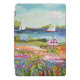 Two Sailboats and Cottage I by Karen Fields. Bright, fun scene with flowers, trees, a cottage, and sailboats out on the water.