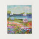 Two Sailboats and Cottage I by Karen Fields. Bright, fun scene with flowers, trees, a cottage, and sailboats out on the water.