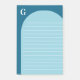Monogrammed and lined sticky notepad in two shades of blue with your initial at the top and a light blue arch-shape with practical white lines for your note-taking, to do lists, and reminders! Blue post-it notepad personalized with your monogram, in two different hues, one deeper blue and one lighter blue, and with a lined page.