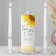 Wedding personalized unity candle set depicts a simple rustic floral watercolor design with elegant yellow sunflowers. It features a portion of inspirational Bible Verse, "Two shall become One." Customize with couple's names and date and initials on tapers.