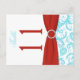 This two-sided aqua blue and white floral damask table number post card has a red PRINTED ribbon and a PRINTED jewel buckle on it that matches the wedding invitation shown below. **You MUST change the number 11's to each of the table numbers you need, add it to your cart, and then return and repeat the process until you have all the individually numbered cards that you need in your cart. ALSO, if you change fonts, or the size of the font, some of the design and/or text may get cut-off. Everything will print as you see it on your monitor. I will not see changes you make, and Zazzle will NOT correct anything (typos, mis-alignment etc.). The text is all customizable. If you need help with this product, please email me BEFORE you place your order. If you require any other matching items, please email your request to niteowlstudio@gmail.com