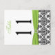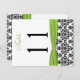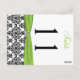 This double-sided black and white damask table number postcard with a chartreuse green FAUX ribbon and jewelled brooch matches the wedding invitation shown below. **You must change the number 11 to each of the table numbers you need, add it to your cart, and then return and repeat the process until you have all the individually numbered cards that you need in your cart. Stand it on a small easel, or in your centerpieces. If you would rather have a greeting card style, email the adderss below. If you need assistance, email niteowlstudio@gmail.com.