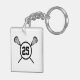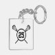 Custom lacrosse number keychain. Black and white, personalized lacrosse player number keychain. White design on black background on one side, reverse black design on white background on the other side. Circle and crossed lacrosse sticks frame with your individualized player number inside.