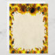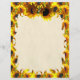 Two bright yellow sunflowers. Floral photography, taken spring 2009 in Corralitos, California. Set against bright yellow background pattern of sunflowers. Blank letterhead paper with stylized flame border.