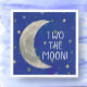 Party napkins with a Two The Moon theme for second birthday parties. The grey crescent moon is on a dark blue night sky background with silver and gold stars.
