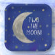 Party plates with a Two The Moon theme for second birthday parties. The grey crescent moon is on a dark blue night sky background with silver and gold stars.
