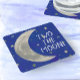 Party coasters with a Two The Moon theme for second birthday parties. The grey crescent moon is on a dark blue night sky background with silver and gold stars.