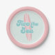 Two the Sea! Surfing Beach 2nd Birthday party plates with turquoise and pink surf board.