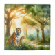A serene forest bathes in the gentle glow of sunlight, creating a peaceful day. Amidst the lush greenery, tigers with a brave look in their eyes, embodying the wild beauty and strength of nature. The vibrant colors of the trees and the warm sunlight enhance the natural splendor of the scene, making it a captivating depiction of the forest's tranquil yet powerful essence.