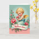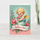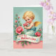 Designed with a sweet garden scene, the card features a winged infant with soft golden curls and bright blue eyes kneeling at the center, offering a small bunch of pink blossoms like a shy gift of affection ❤️. The figure wears a pale aqua gown tied with a blue ribbon, and the rosy cheeks and gentle gaze suggest a tender, caring bond in the moment. Behind it, the background fades from mint green at the top to blush pink near the bottom, giving the setting a calm, romantic glow. Full pink roses and deep green leaves frame the scene on both sides, surrounding the figure as if it’s tucked into a quiet floral corner. Across the lower portion, a cream banner stretches horizontally with a message written in deep red lettering, accented by small blue decorative curls. A lace-like trim line separates the two background colors, adding a soft, old-fashioned touch 🌼. The lighting stays airy and gentle, making the flowers and wings look softly highlighted rather than harsh. The cream banner sits just above the bottom edge, with the red text centered and the blue flourishes curling outward.