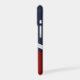 This bold and colorful two tone phone case pairs dark navy blue with red and a silver V shaped stripe. Your monogram is in matching navy blue script at the bottom. Modern and classy for either a man or a woman.