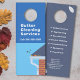 Two tones blue colors door hanger with an illustration of a roof and gutter of a house and some fall leaves. It could be used for small business such as roof and gutter cleaning or repair, moss removal, handyman, pressure washing service, etc.