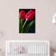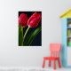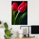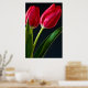 Two tulips dance in the morning light, moisture clinging to their petals.