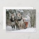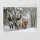 Postcard with two beautiful white horses pulling a sleigh through the snow in the woods.