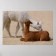 Two young alpacas, (Vicugna pacos) one white and the other brown, on the sand