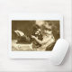 This lovely vintage photography shows a girl with her toy cat sitting in front of a typewriter.