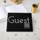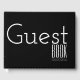 A beautiful bold white font says "guest book" and has a template below it for the date of your important function or event. The color of the background may be changed from black to any of your choice.