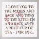 A funny design based on hearts and text. The poster is covered with outlined hearts colored pink and blue, and a larger set of two hearts is centered. A massive text is written in playful font: "I LOVE YOU TO THE MOON AND BACK AND THEN TO THE KITCHEN AND BACK WITH A NICE CUP OF TEA - FOR ME...". A pretty sweet and funny text that can easily be customized. Replace "tea" with "coffee" if that is your... um, cup of tea. Solid gray background color can also be adjusted. Note that if you choose a darker background, the text might need a lighter font color.