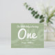 An our little baby is turning one first baby birthday postcard invitation. This postcard is sage, green, and white. The word "One" is in large letters in a cute typography style with a modern and minimal design. Simply customize this postcard invitation, add it to your cart, and happy birthday to your wonderful baby!