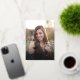 Photo on front and back... Casual graduation invitation announcement with mortarboard graduation cap icon, perfect for the high school or college grad. Modern minimalist typography, casual elegant script "Graduate" writing. Capture those special moments of growth and smiles of joy and youthfulness for all time. Upload a full portrait-mode cover photo of the graduate on front, and a landscape orientation photo als well as pertinent details of the graduation party on back. Automatically shades the perfect areas of the pic.
