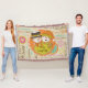 Pretty Christmas holiday throw blanket with typography text sayings background, stars, snowflakes, polka dots on orange, and a snowman couple in top hat and winter hat and scarf with a mustard yellow banner that reads Merry Everything!