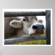 Photograph of a Tyrolean cow poking her head through a wooden fence.