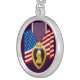 Purple Heart Necklace. This sterling silver necklace is decorated with the Purple Heart Medal superimposed on the US Flag.
