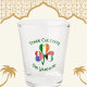 Shot glass features the flags of the United Arab Emirates (UAE), Ireland, and United States of America (USA) in the leaves of this shamrock, designed to celebrate St. Patrick's Day, 4th of July and UAE holidays. Above are the words THREE CULTURES, below, ONE YOURNAME. Words on shot glass are in dark green, Celtic style, circular letters. Add your name to the proper spot for a personalized touch. For a customized gift just add someone else's name.