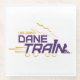 The UAlbany Dane Train logo features bold, angular typography with the words "Dane Train" in large, purple capital letters. Above it, "UAlbany" is written in a smaller, golden font. The design incorporates the silhouette of a train, with smoke billowing from the smokestack. The train's wheels are represented in gold, giving the appearance of movement, and golden streaks on the left emphasize speed and momentum. The logo exudes a dynamic and energetic vibe, combining elements of strength and motion, reflecting a sports or team spirit.