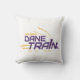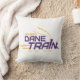 The UAlbany Dane Train logo features bold, angular typography with the words "Dane Train" in large, purple capital letters. Above it, "UAlbany" is written in a smaller, golden font. The design incorporates the silhouette of a train, with smoke billowing from the smokestack. The train's wheels are represented in gold, giving the appearance of movement, and golden streaks on the left emphasize speed and momentum. The logo exudes a dynamic and energetic vibe, combining elements of strength and motion, reflecting a sports or team spirit.