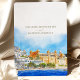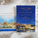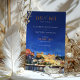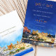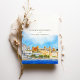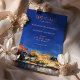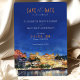 Announce your wedding with this exquisite "Save the Date" card featuring a stunning watercolor depiction of Udaipur, Rajasthan. The card showcases the city's regal architecture and lakeside charm, capturing the grandeur of the palaces and surrounding landscapes. The front design presents a vibrant scene under a clear blue sky with golden hues reflecting off the ornate buildings. The back complements the theme with a night-time view, featuring illuminated palaces glowing against a deep navy backdrop. The combination of warm ochre, gold, and rich blue tones adds a romantic and luxurious feel, making it ideal for a destination wedding in India's "City of Lakes."
