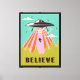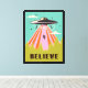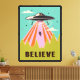 Mod pop art inspired alien abduction with spaceship ufo in colors of teal, orange, pink, lime green, cream and black wall art. Great quirky look for any room if you believe!