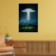 ufo and child in field at night poster. This poster depicts an innocent child and an encounter at night with a UFO in a field. The childs tricycle can be seen being beamed aboard the UFO ship while the child sits below the beam. This surreal image poster has a haunting quality and is one of a series of strange and wonderful science fiction photo posters.