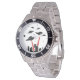 Has heft and feel of expensive stainless steel quartz watches. Good band with safety catch. I removed links, which is easy because engraved arrows show direction to push the linking pins. As always by this seller, the image (a railroad logo) is a perfect reproduction of my emailed image, and is precisely spaced and aligned.